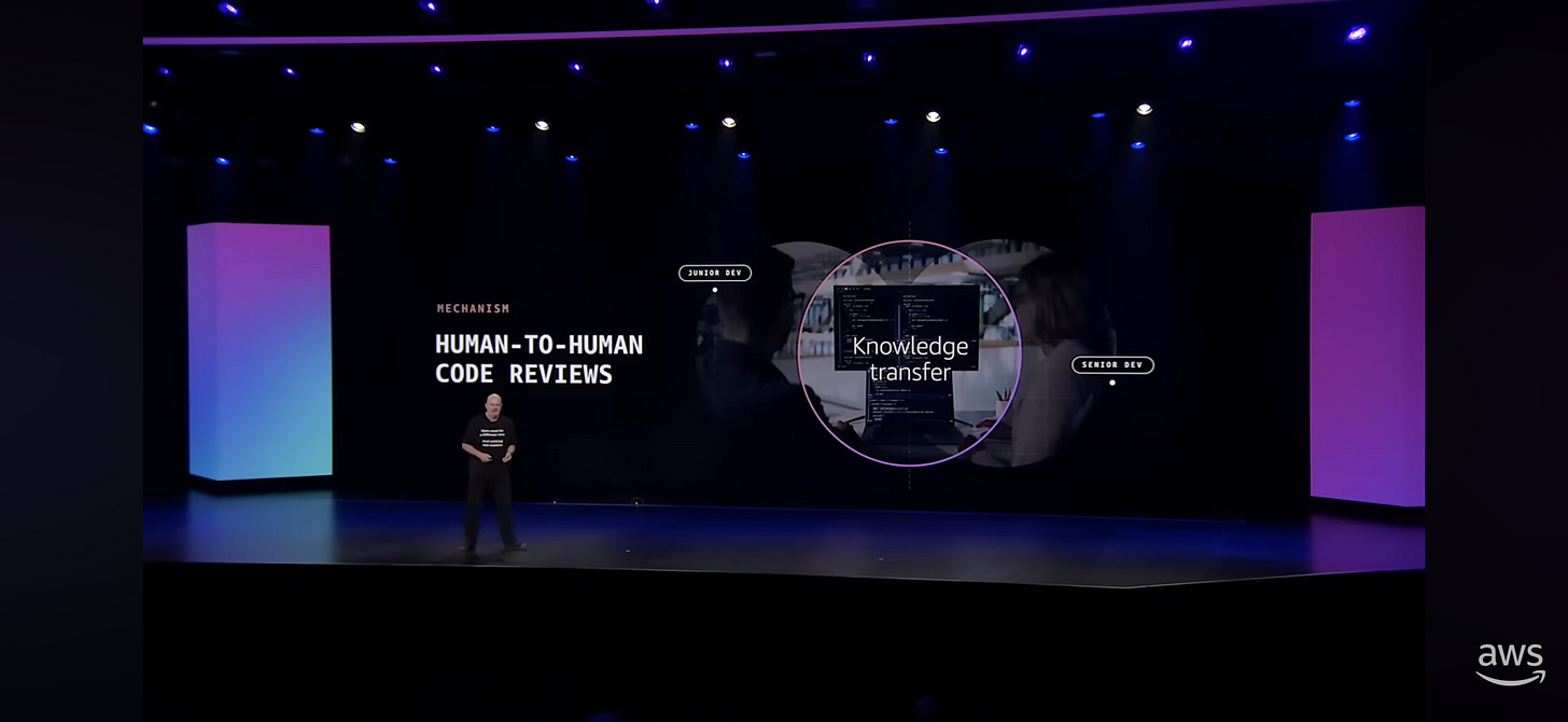 Werner starts with a short video highlighting past “end of developer” moments: assemblers, compilers, structured programming, object-oriented design, the shift from monoliths to services, and the move from on-premises to cloud computing. Each change reshaped how software is built. Each expanded the role of developers. And each time, the number of developers continued to grow. There are nearly a million more of us compared to last year.
