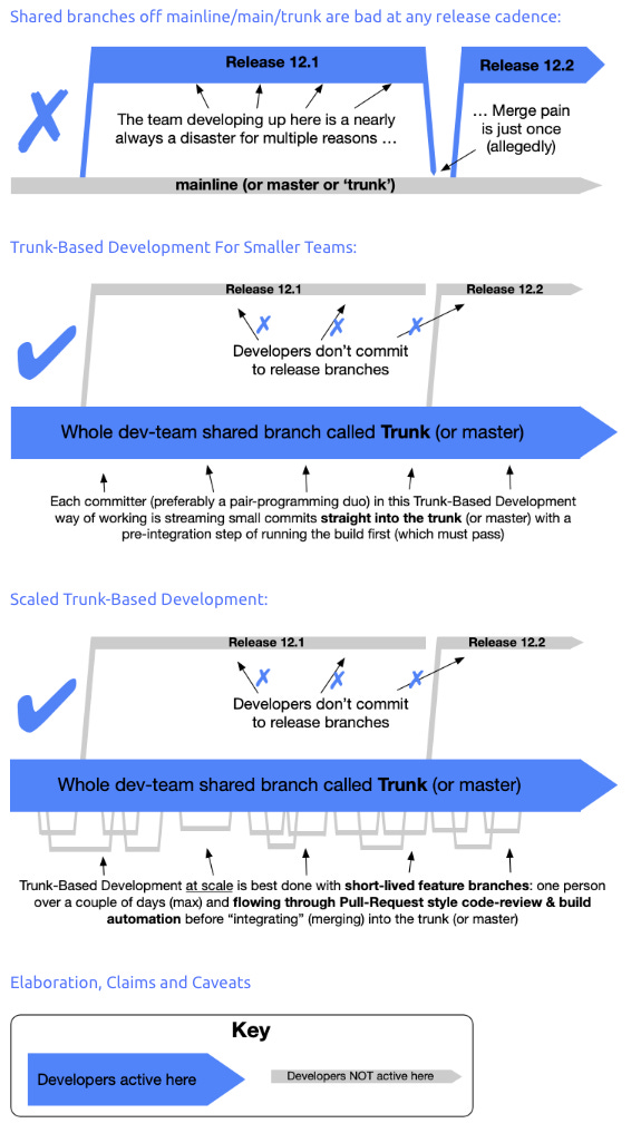 A common pushback for Trunk Based Development is that it’s risky. Actually the reverse is true. Making features bigger, extending branches just increases risks. It puts more pressure on the releases.