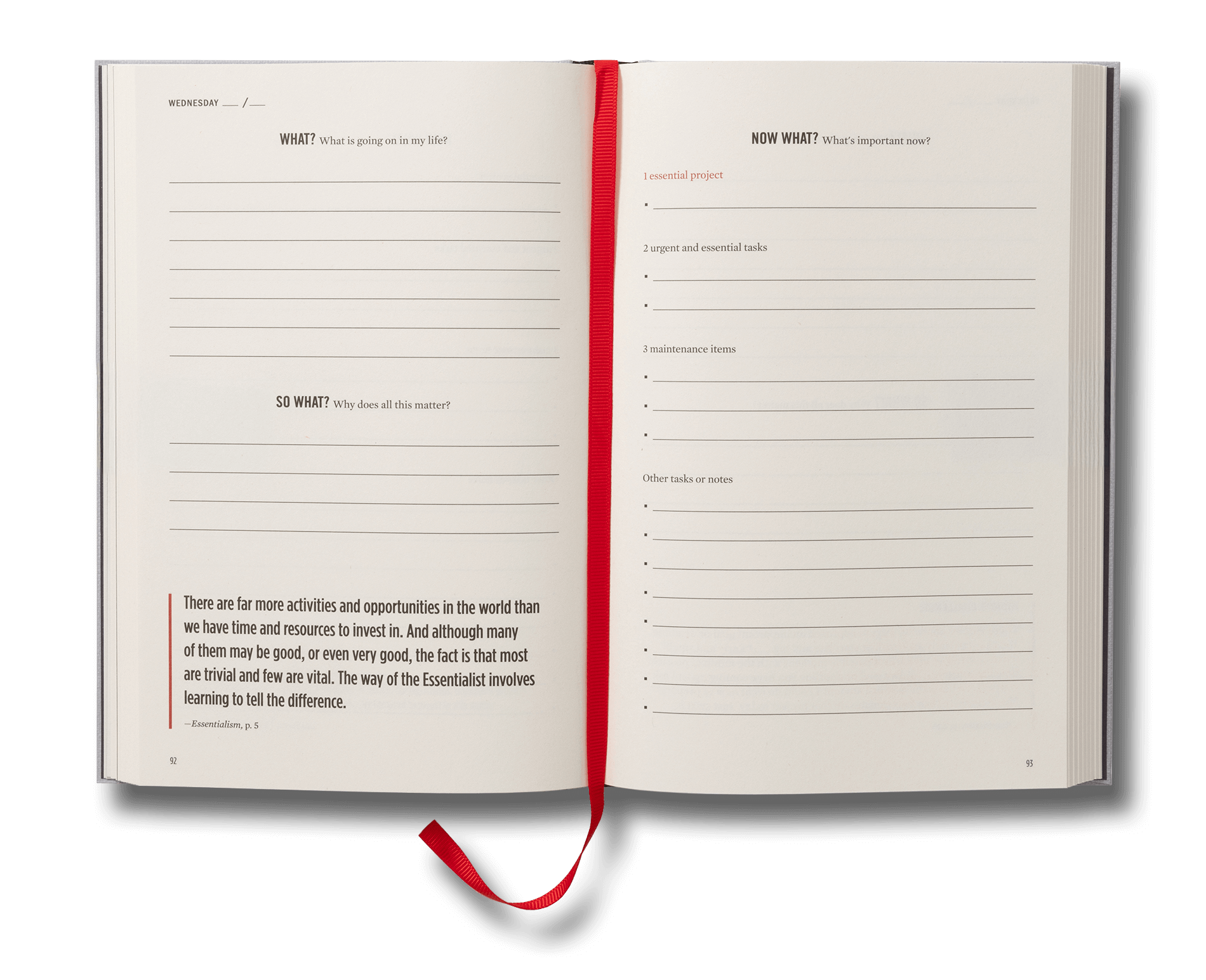 For full details of the planner take a look here: https://gregmckeown.com/books/the-essentialism-planner/